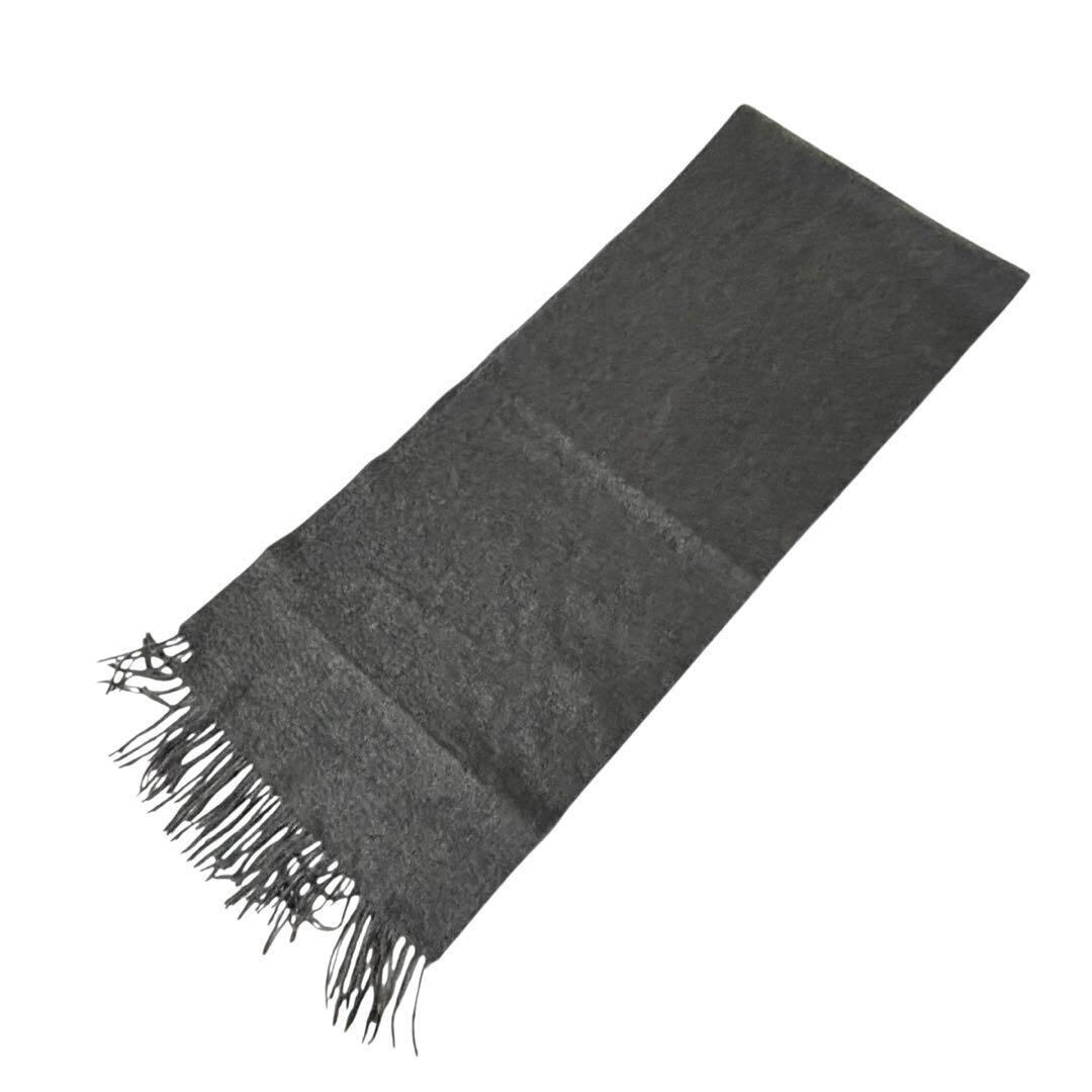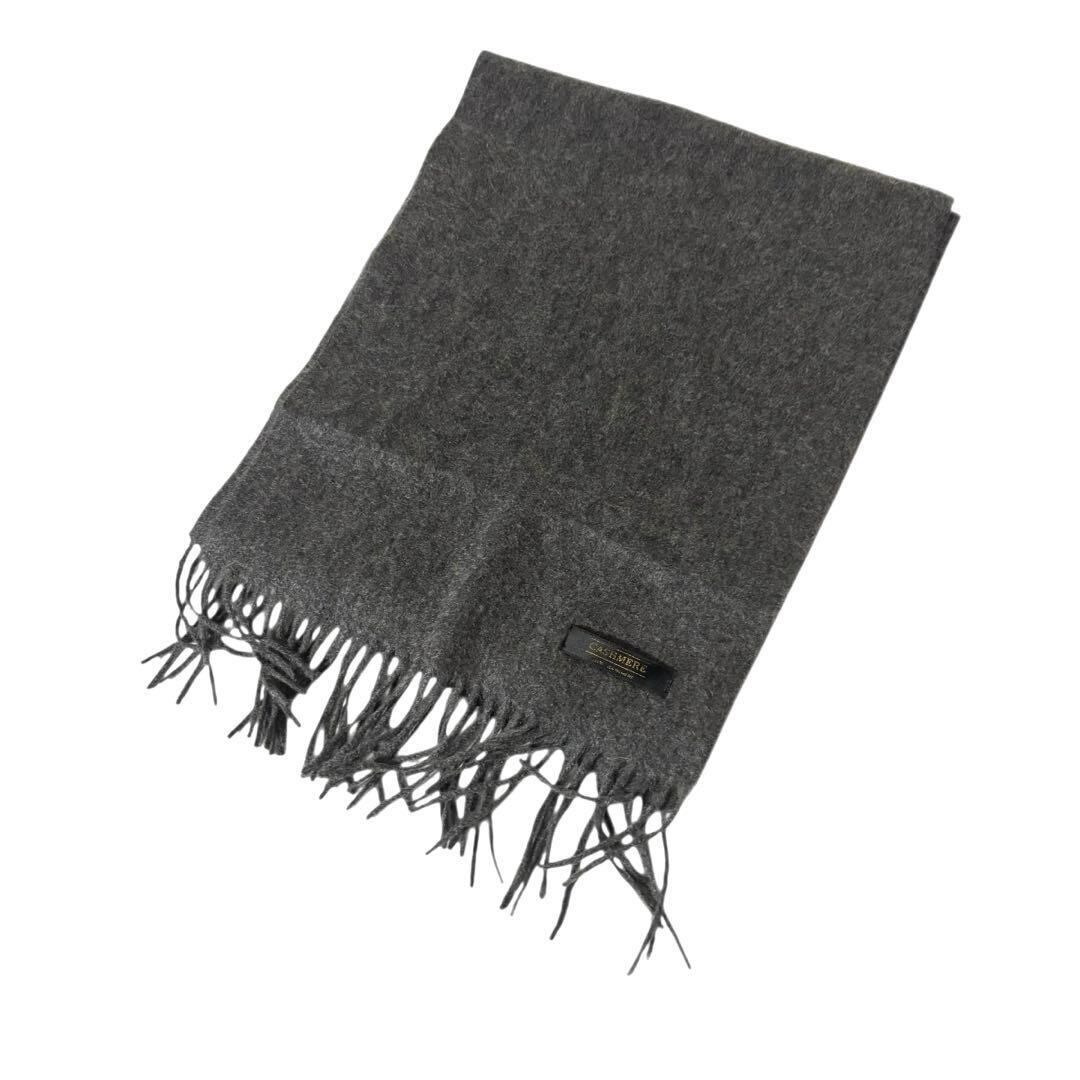 ダークグレーのフリンジ付きマフラー、シンプルなデザインでコーディネートしやすいです。